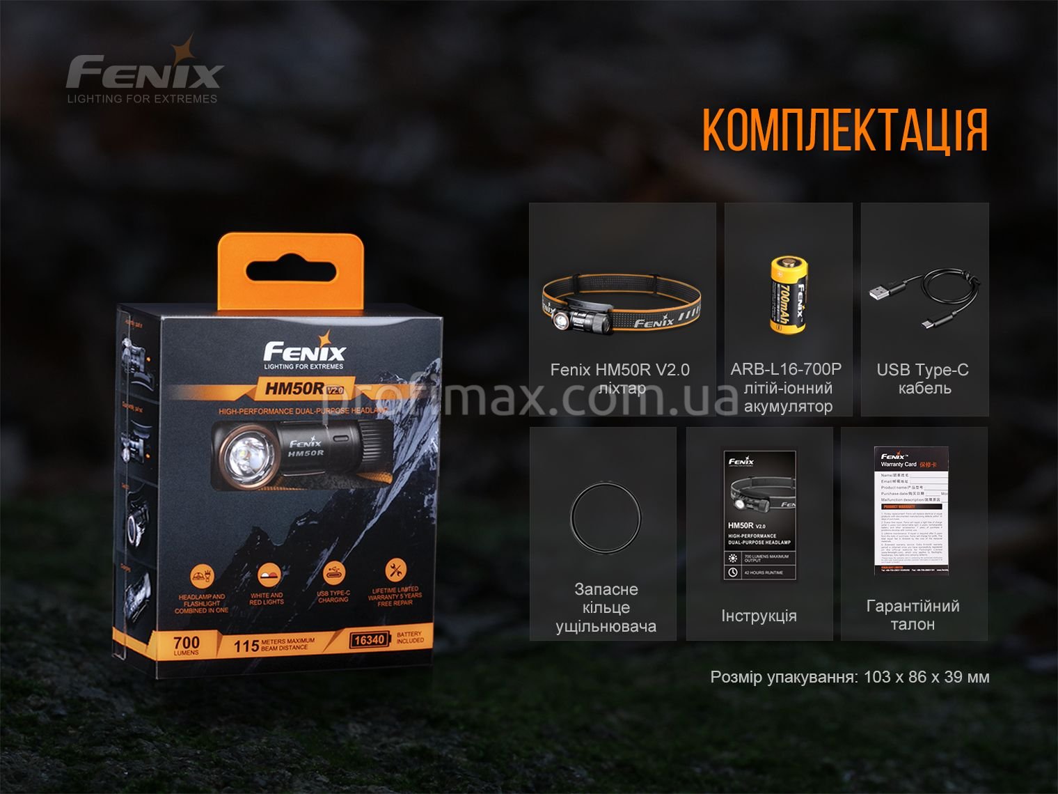 Ліхтар Fenix HM50R V2.0, акумулятор Fenix ARB-L16-700Р Li-ion, кабель для зарядки USB Type-C, комплект кріплення на голову, запасне кільце ущільнювача, керівництво користувача, талон гарантії.