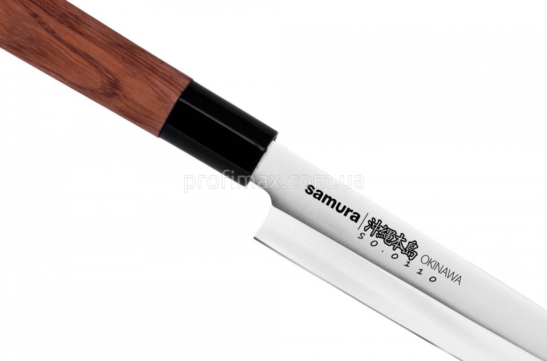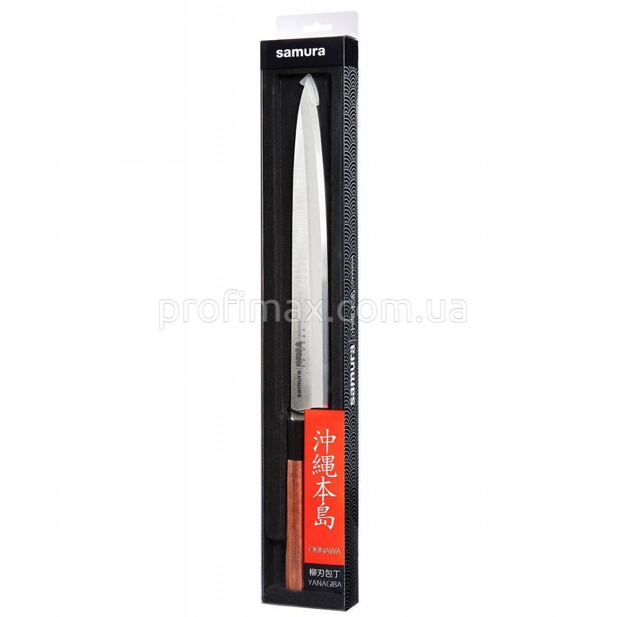Samura Okinawa SO-0110 - ніж Янагіба із одностороннім заточенням і дуже довгим вузьким гострим лезом, незамінний при нарізці на найтонші скибочки рибу, ковбаси, балики, м'ясо, морепродукти. Японська нержавіюча сталь AUS-8, з якої виготовлений ніж, має гарну корозійну стійкість, відмінну стійкість ріжучою крайки, легко полірується й шліфується. Класична рукоять ножа, виконана з африканського палісандра, зручно лежить у руці й забезпечує максимальний комфорт у роботі. Цей ніж стане справжнім подарунком для цінителя японських кулінарних традицій.