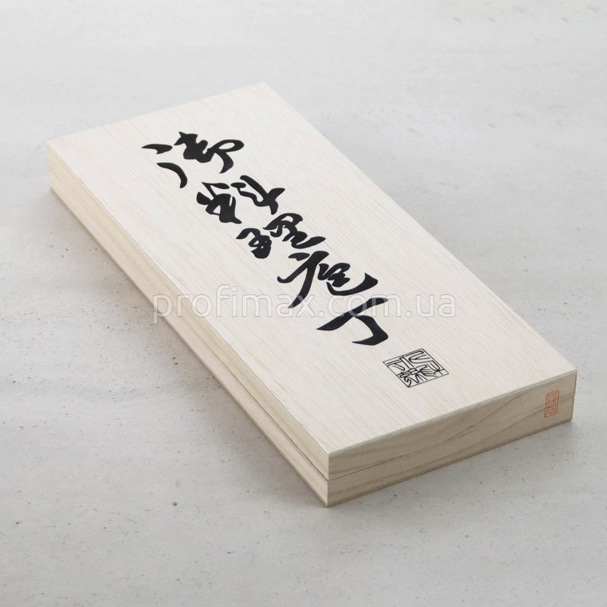 Набір з 2 кухонних ножів, упакованих в традиційну японську дерев'яну упаковку, стане ідеальним подарунком для будь-якого любителя кулінарії. Ножі з молібден-ванадієвої сталі, загартованої до твердості 56-58 HRC, ідеально підходять для домашніх умов.