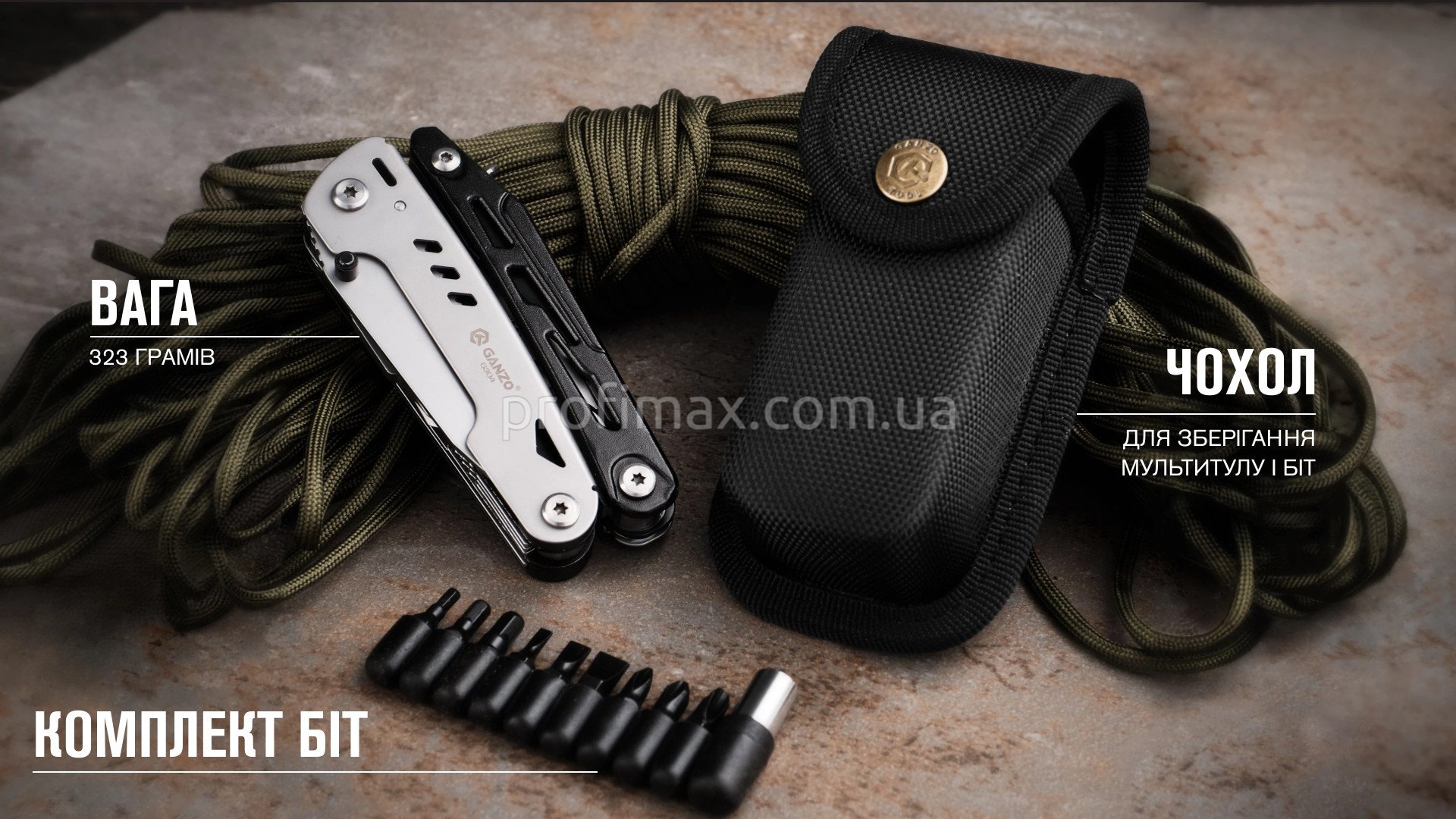 Основным инструментом мультитула Ganzo G304 являются пассатижи, предназначенные для захвата мелких деталей. Прочность удержания обеспечивается вследствие ребристой поверхности удлиненных губок. Ближе к основанию пассатижей находятся два лезвия, выполняющих роль кусачек для работы с проводом и проводами. Кроме них, конструкция содержит 5 сложных элементов, которые в совокупности выполняют около десятка функций. В рукоятях спрятаны следующие инструменты: клинок с прямым лезвием, пила с серейторной заточкой, крестообразная отвертка, штопор. Ножницы также являются частью мультитула. Они отсоединяются от основной конструкции для удобной эксплуатации. С одной из сторон рукоятки ножниц нанесена сантиметровая линейка. Функционал Ganzo G304 расширяют 9 сменных бит, входящих в набор вместе с держателем, чтобы превратить мультитул в отвертку, необходимо зафиксировать держатель на элементе с крестообразным наконечником, а затем — поместить в держатель необходимую биту.