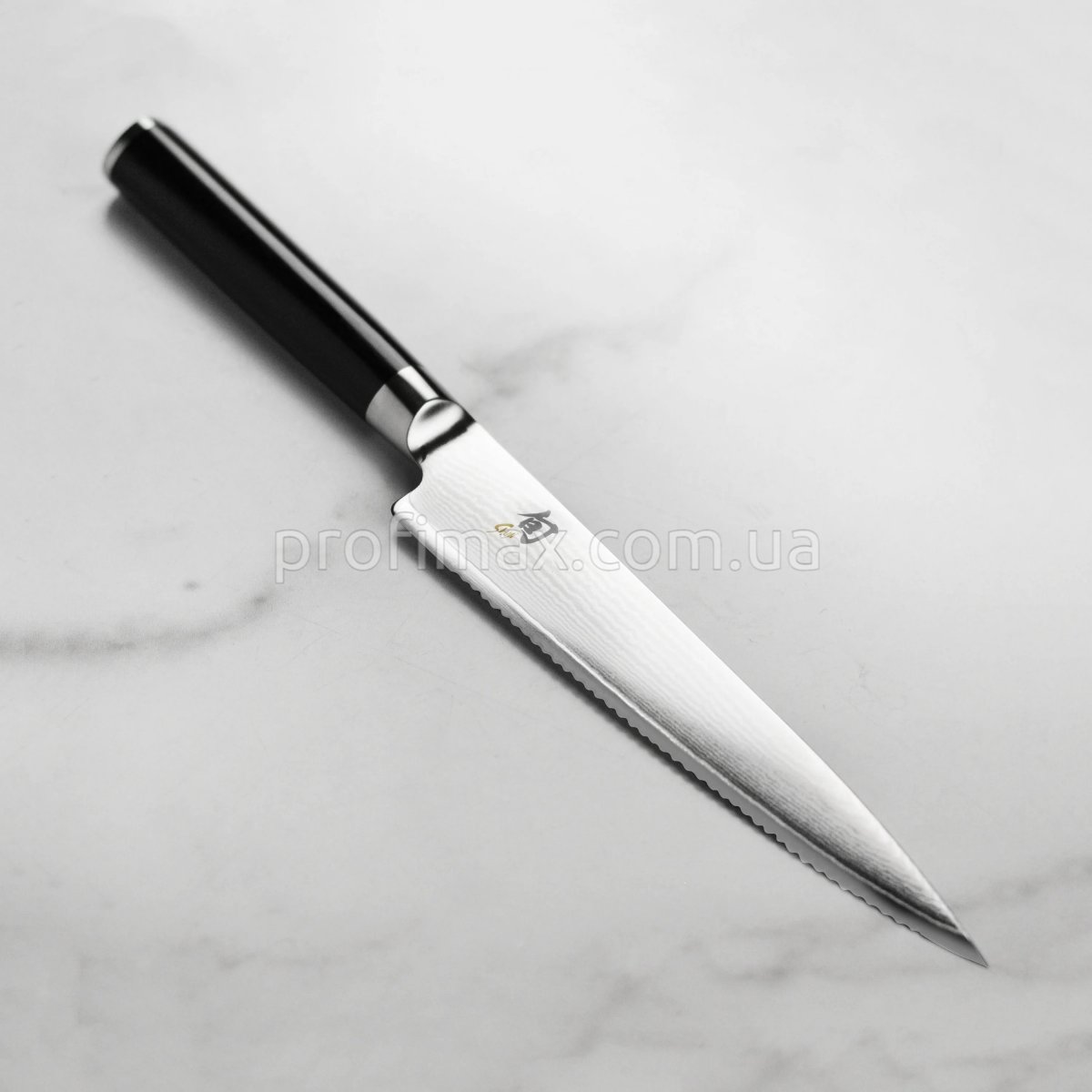 Нож KAI SHUN CLASSIC DM-0722 Tomato Knife - профессиональный японский нож для томатов от производителя KAI с волнистой режущей кромкой, с мелкими зубчиками на лезвии ножа. Предназначен для нарезки помидор и продуктов с мякотью. Кухонный нож нож очень удобный в нарезке, великолепно нарезает томаты не разрывая сердцевину, отлично подходит для нарезки хурмы, дыни, арбуза и прочих мягких овощей и фруктов. Профессиональные ножи высочайшего качества серии Shun объединили в себе мастерство ручной работы, высокоточную технику исполнения и элитный стильный дизайн. Кухонный нож изготовлен под правую руку из 32-х слойной узорчатой дамасской стали безупречной остроты, внутренний слой лезвия выполнен из высококачественной стали VG-MAX, устойчивой к коррозии, которую практически невозможно сломать. Лезвие ножа имеет двухстороннюю заточку, позволяет исполнять точную и тонкую нарезку без прилипания пищи к поверхности ножа, работать с различными продуктами и доставлять невероятное удовольствие на протяжении длительного времени. Удобная рукоять ножа изготовлена из одной из самых красивых древесин в мире - черного дерева Пакка (PakkaWood), которое обладает прочностью намного выше чем у дуба и, благодаря насыщенности маслянистыми веществами и особой обработке, не подвержена гниению и порчи насекомыми. Нож оснащен больстером (цельнометаллическим кольцом), что не позволяет руке прикасаться к очень острому лезвию ножа и благодаря чему предотвращается скопления пищи в местах соединения с лезвием. Оголовье рукоятки (пятка рукоятки) - из нержавеющей стали SUS 416, которая продлевает срок службы ножа. Кухонный нож для томатов одним движением руки позволит выполнить искусную и точную нарезку необходимых продуктов и сделать презентацию блюд незабываемой.