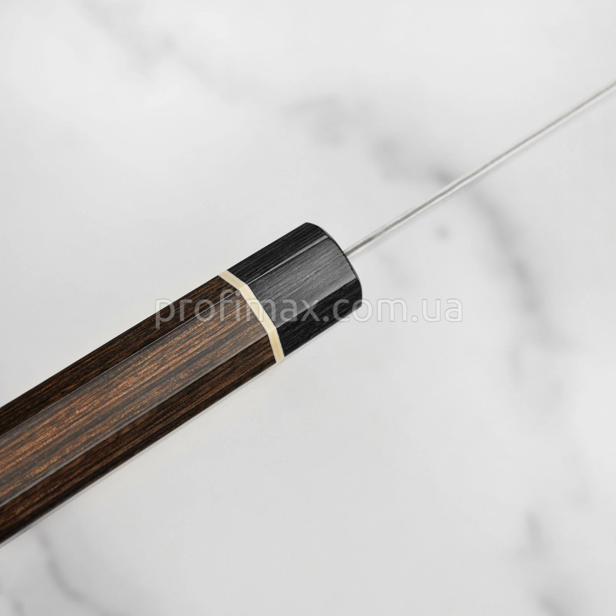 Восьмиугольная полированная рукоятка коричнево-черного цвета из дерева Pakkawood, плавно сужающаяся от конца ручки к лезвию, а кольцо из белого волокна возле болестера, делает стильный акцент в дизайне. Pakkawood – это ламинированная древесина ценных пород, пропитанная смолой в вакууме под высоким давлением. Он характеризуется очень высокой стойкостью к теплу и влаге, и был разработан специально для ручек ножей, разработан прежде всего для долговечности и устойчивости к износу.
