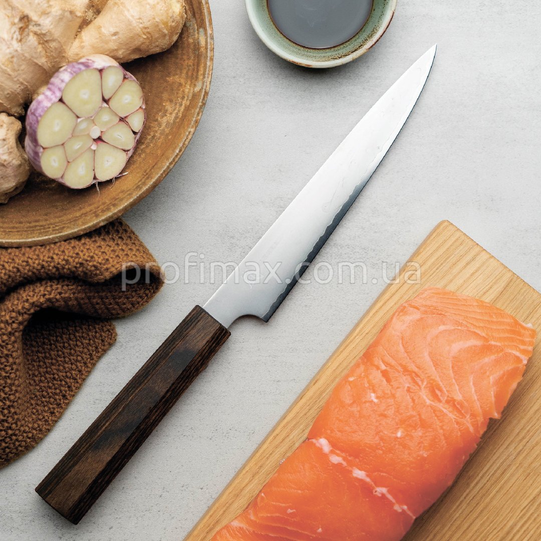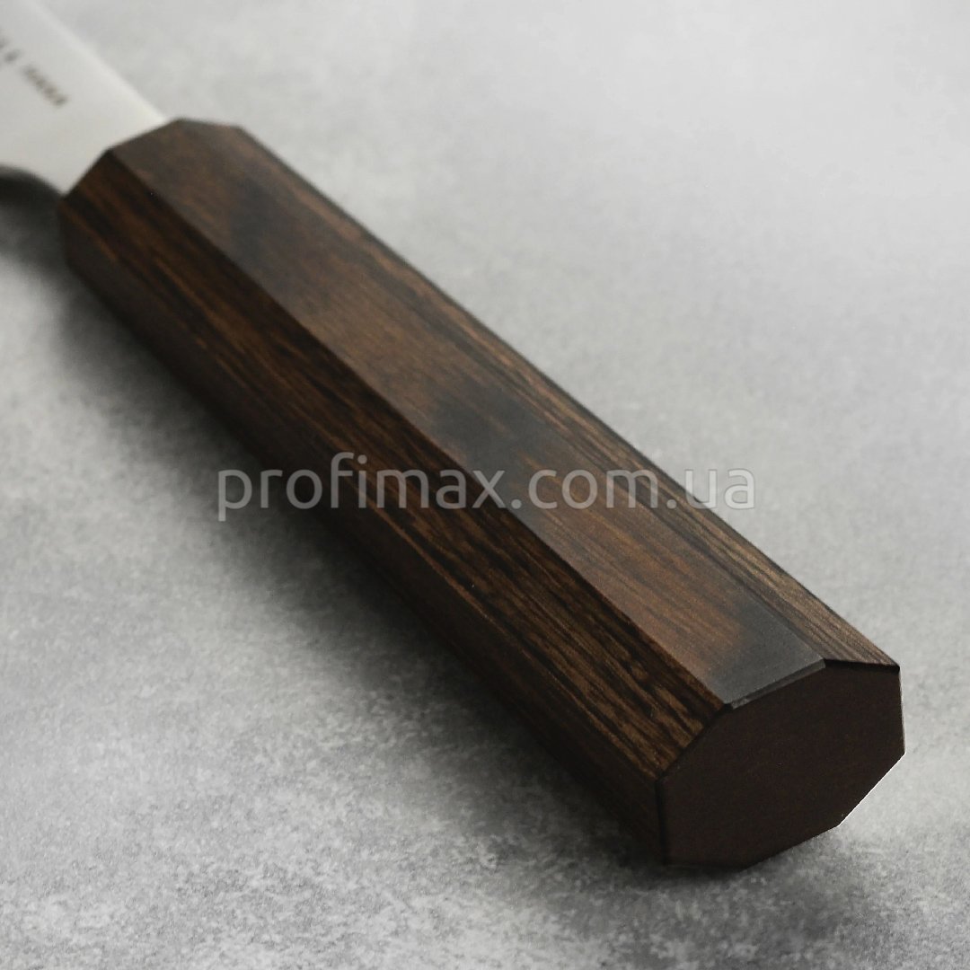 Премиальная восьмиугольная темно-коричневая ручка Pakka Wood (композит дерева и смолы), разработанная опытными дизайнерами Yaxell, обеспечивает идеальный баланс и оптимальный контроль.