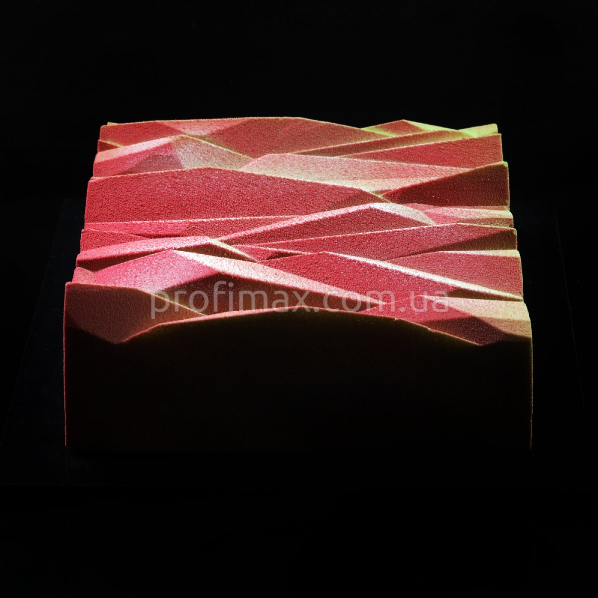Ще одна форма ручної роботи із серії “Геометрія” для журналу SoGood. Торт “Lime-basil Triangulation”. Усередині: мус лайм-васильок з італійською меренгою, лаймовий мус-маршмеллоу, конфі лайм-васильок, бісквіт, хрумкий шар з мигдальними пластівцями. Основна тема моїх робіт з'єднання архітектури й кондитерського мистецтва, моделювання й печатка моделей, робота із силіконом. У цьому випадку я використовую принцип тріангуляції для створення тривимірної поверхні. Ми поліпшили форму, зробили форму більш надійну в роботі. Виконана з харчового силікону. Форма продається разом з каркасом, який використовується під час складання для збереження точності геометрії форми.